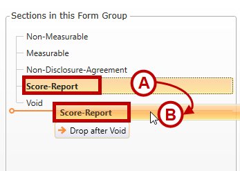 Drag and drop the section names in the desired order. In the example above, the section named Score-Report should appear after the section named Void. So, the user is dragging the name Score-Report (A) below the name Void (B):