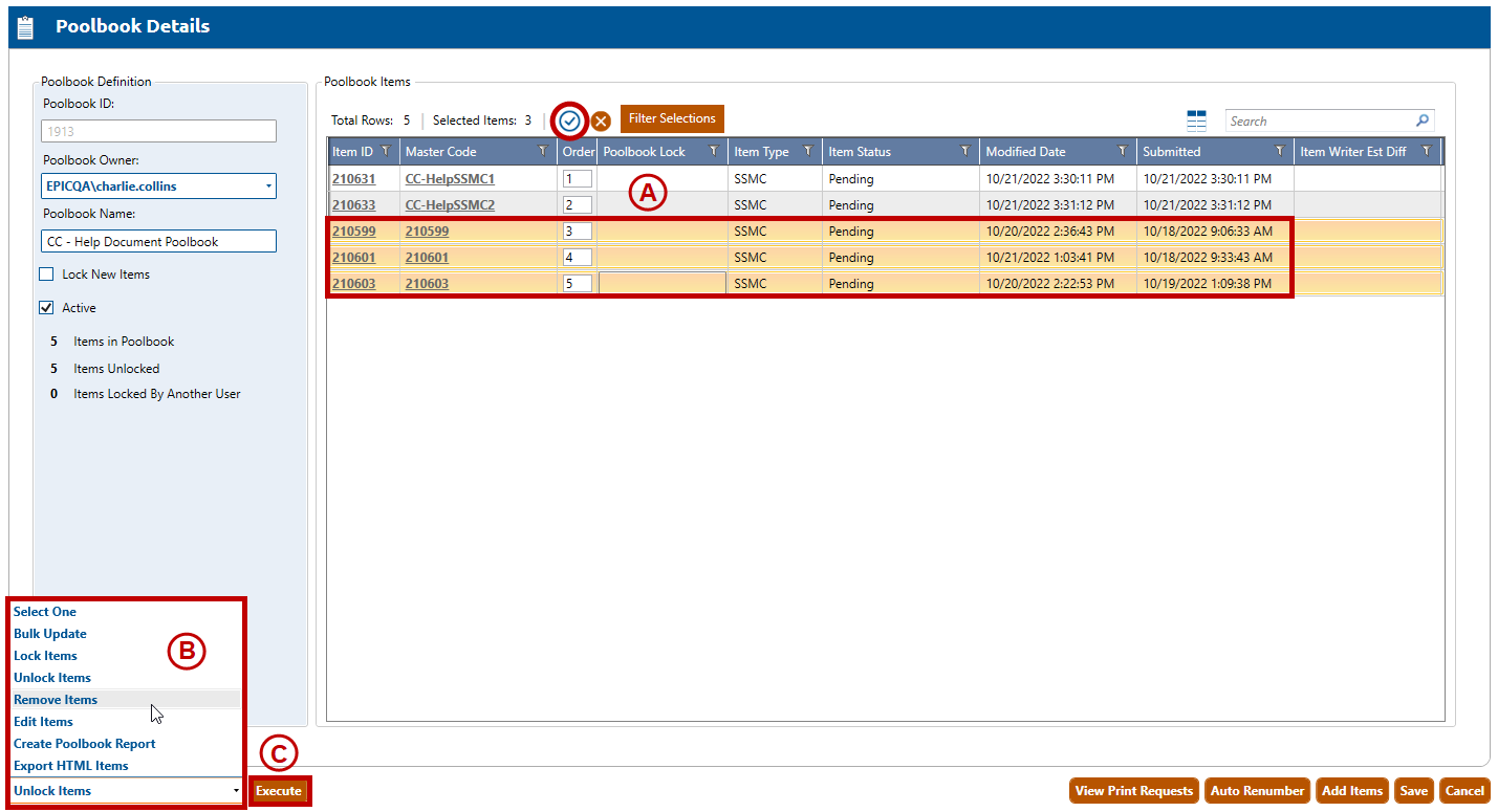 A. Select the poolbook items that you wish to remove from the poolbook. To select all poolbook items, click the checkmark button (circled, above). In the example above, the user has selected three poolbook items to remove.