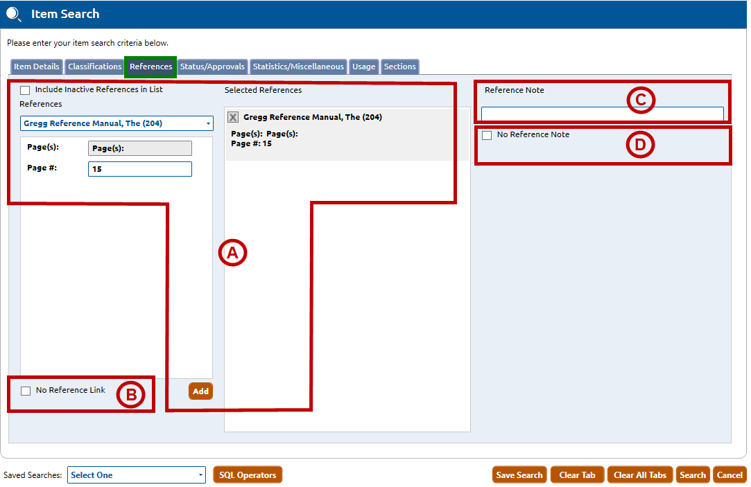 1. On the Item Search screen, click the References tab (highlighted in green), then follow Steps A through D, below: