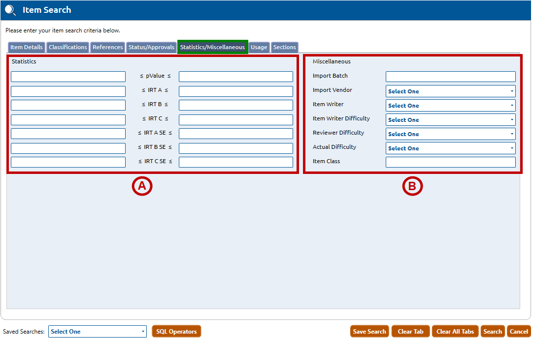 1. On the Item Search screen, click the Statistics/Miscellaneous tab (highlighted in green), then follow Steps A and B, below: