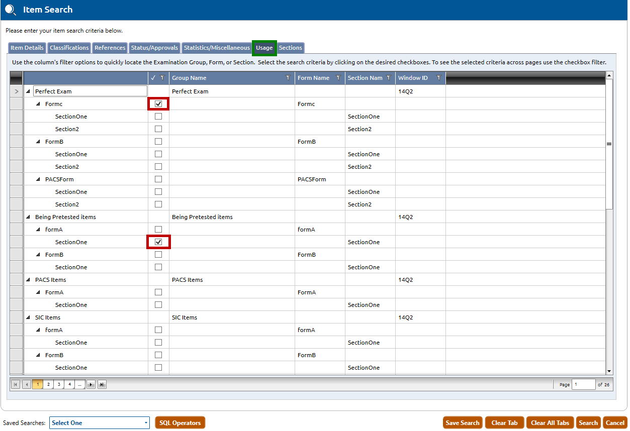 2. The table lists all the Exam Form Groups in the current section. Under each Exam Form Group is a selectable list of each of the forms in the group and the sections within each form. Clicking the checkbox(es) (highlighted in red, above) will include all items in that form or section for that EFG in the search criteria. One or multiple selections can be made.