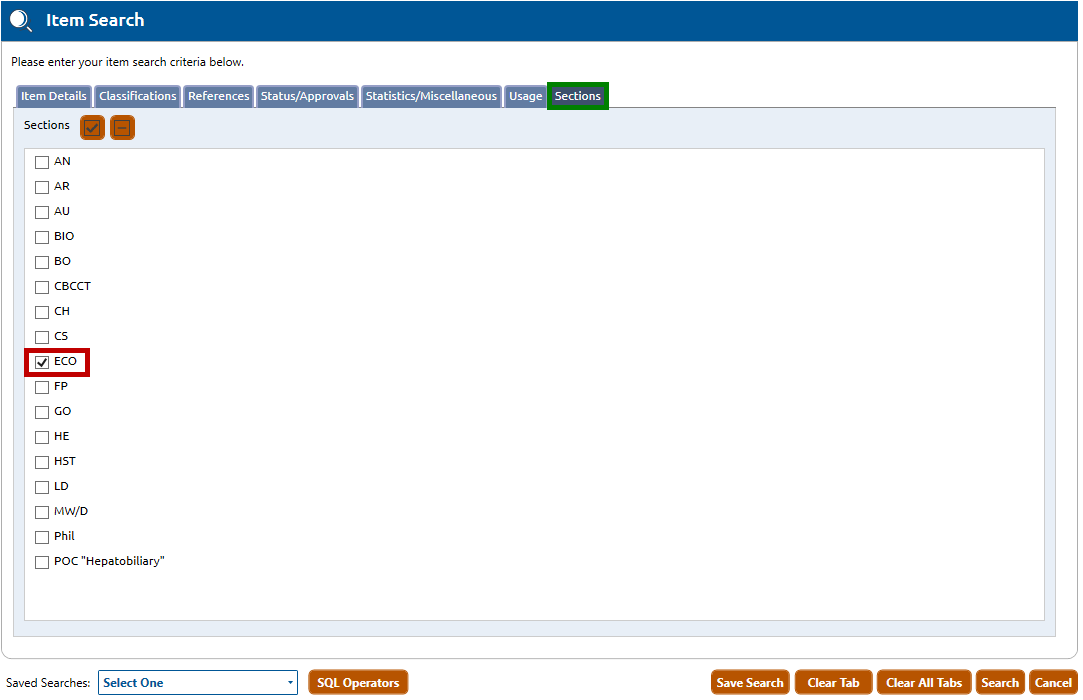 1. On the Item Search screen, click the Sections tab (highlighted in green).
