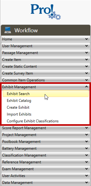 1. In the Workflow menu, click Exhibit Management > Exhibit Search:
