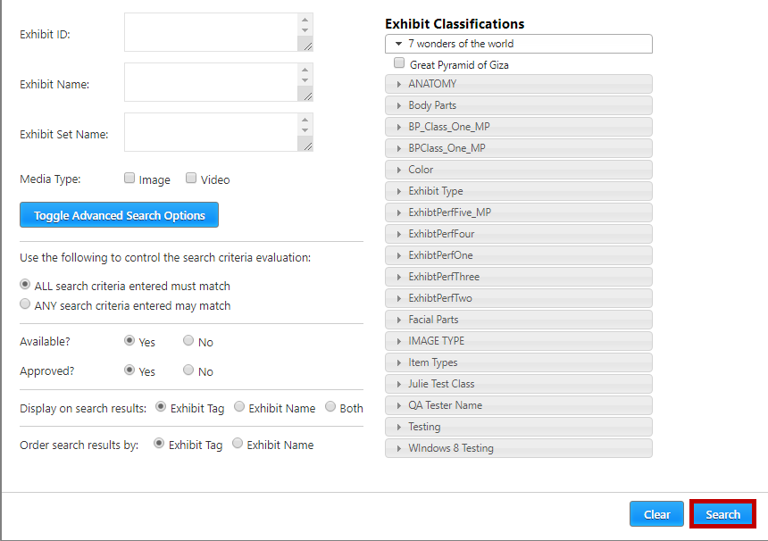 2. The Exhibit SearchCriteria screen will appear (shown below). This screen allows the entry of a variety of details to help narrow the exhibit search including, but not limited to, Exhibit ID, Exhibit Name, Exhibit Set Name, Media Type, and Exhibit Classifications.