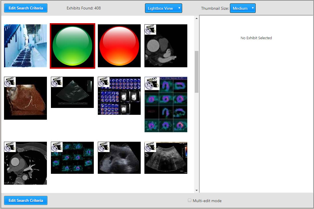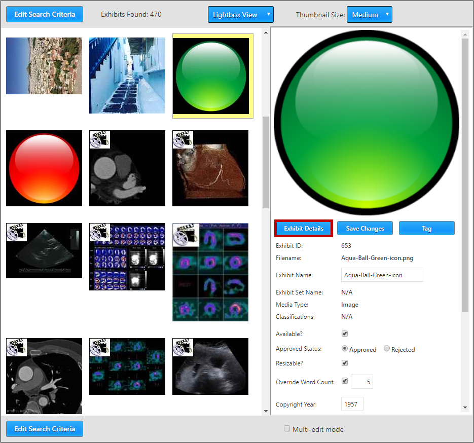 4. Clicking on the thumbnail for one of the displayed exhibits (highlighted in red, above) will populate the right pane with the exhibit details (shown below). If the exhibit is not locked, some of those details will be editable to users with the proper authorization.