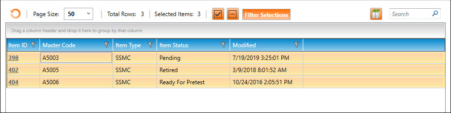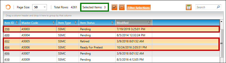 Click a record to select it—the record becomes highlighted in yellow. Click more records to select them, too (note that you do not need to hold the <CTRL> key to select multiple records). To deselect a record, click it again. In the example below, three records are selected (highlighted in red, below). The number of records selected is shown at the top of the display (highlighted in green, below).