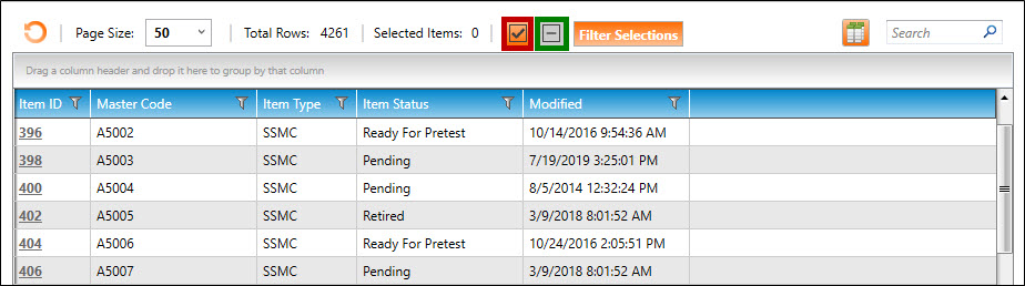 Click the Select All button (highlighted in red, below) to select all records. Click the Clear All Selections button (highlighted in green, below) to deselect all records.