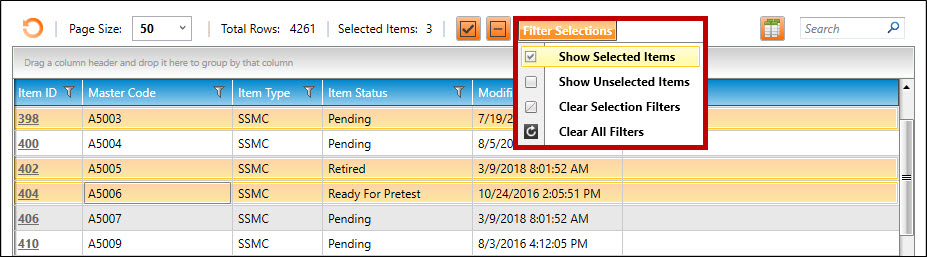 Click the Filter Selections button, then Show Selected Items (highlighted in red):