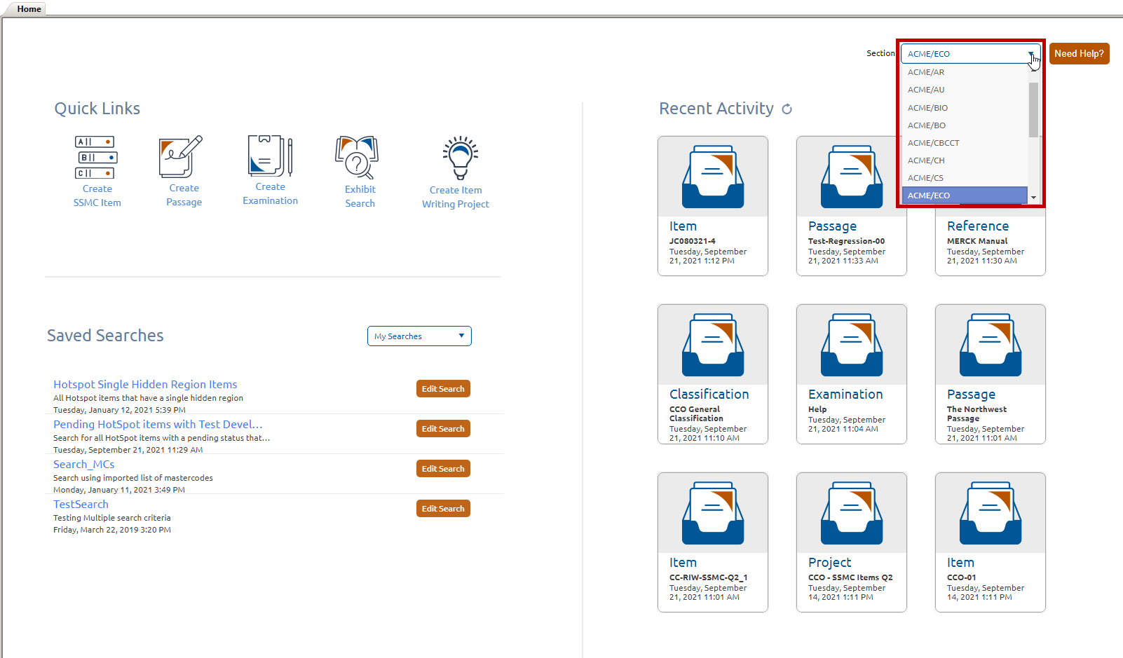 1. From the Home tab, click the Section dropdown list and choose a different section (highlighted in red):