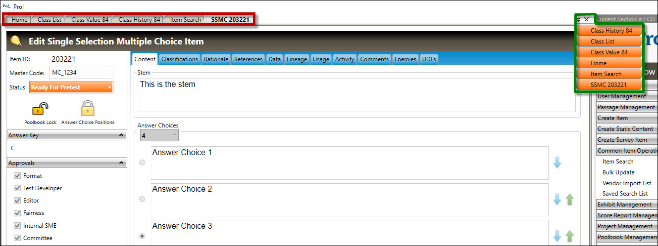 When working in Pro!, all content is displayed in tabs that line up (by default) across the top of the Pro! workspace (highlighted in red, below). The active tab's heading is labelled in boldface (in the example below, the SSMC 203221 tab is active).