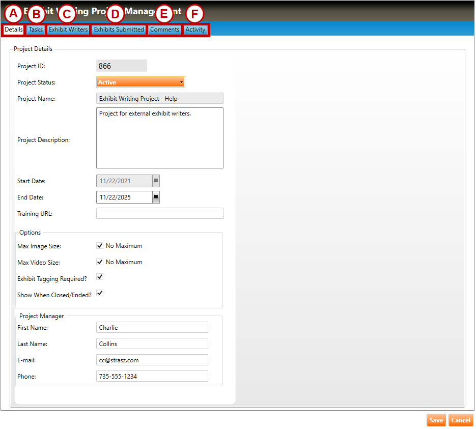 3. The Exhibit Writing Project Management screen will appear (shown below). Navigate through each of the six tabs (labeled in the figure below) to view information related to the project.