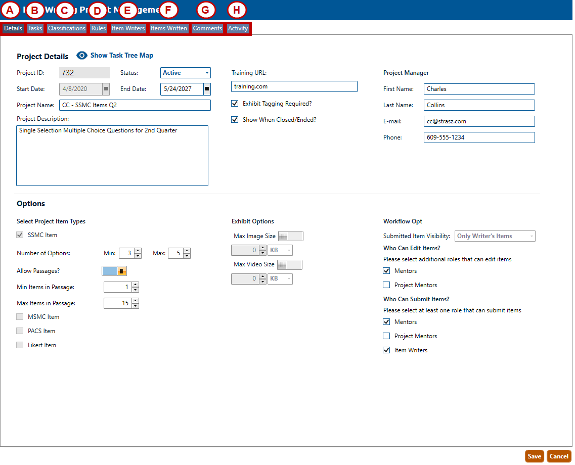 3. The Item Writing Project Management screen will appear (shown below). Navigate through each of the eight tabs (labeled in the figure below) to view information related to the project.