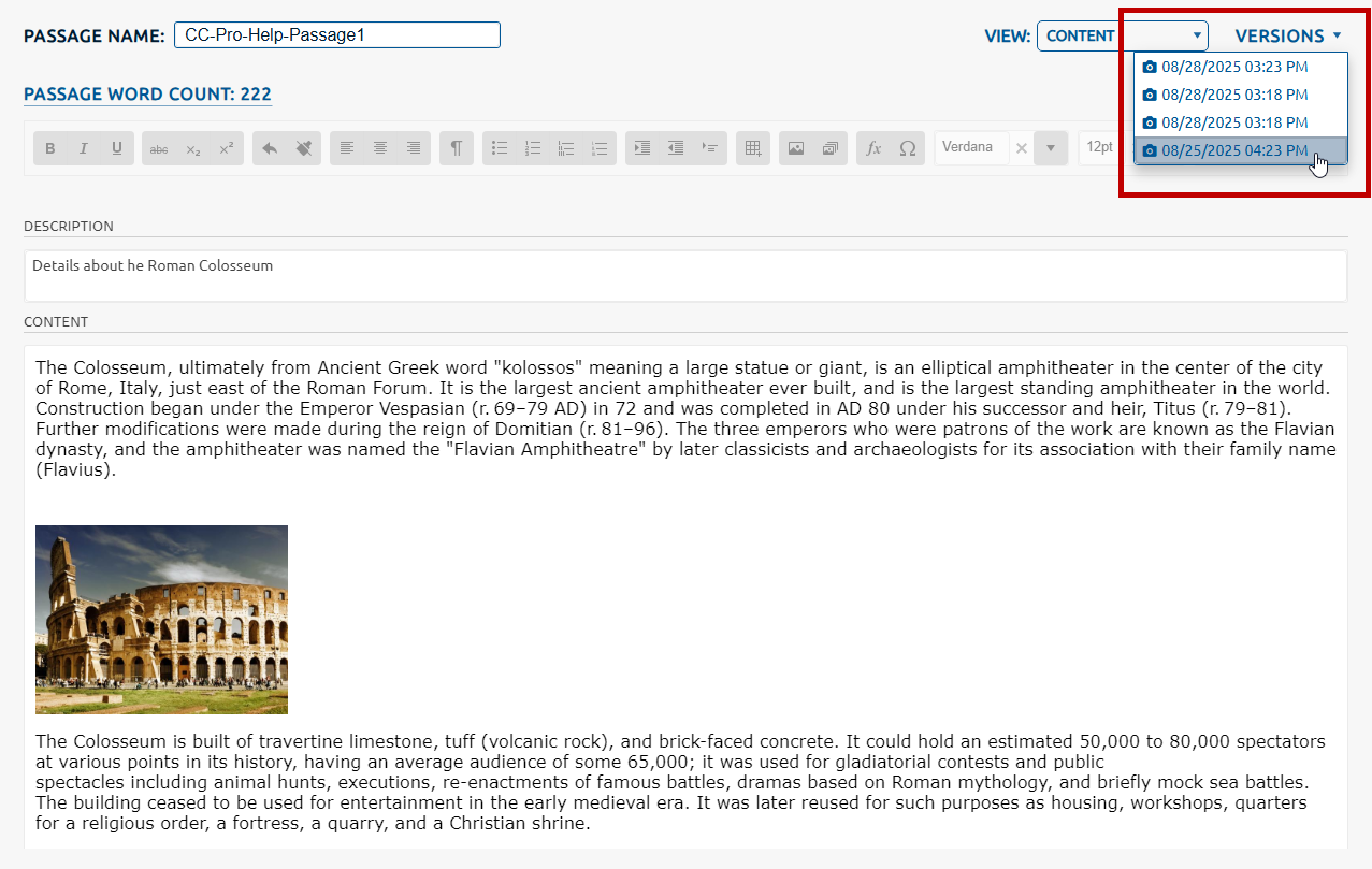 3. Select the desired timestamp hyperlink from the Versions dropdown (highlighted below) to view the passage content as it was saved at that date and time.