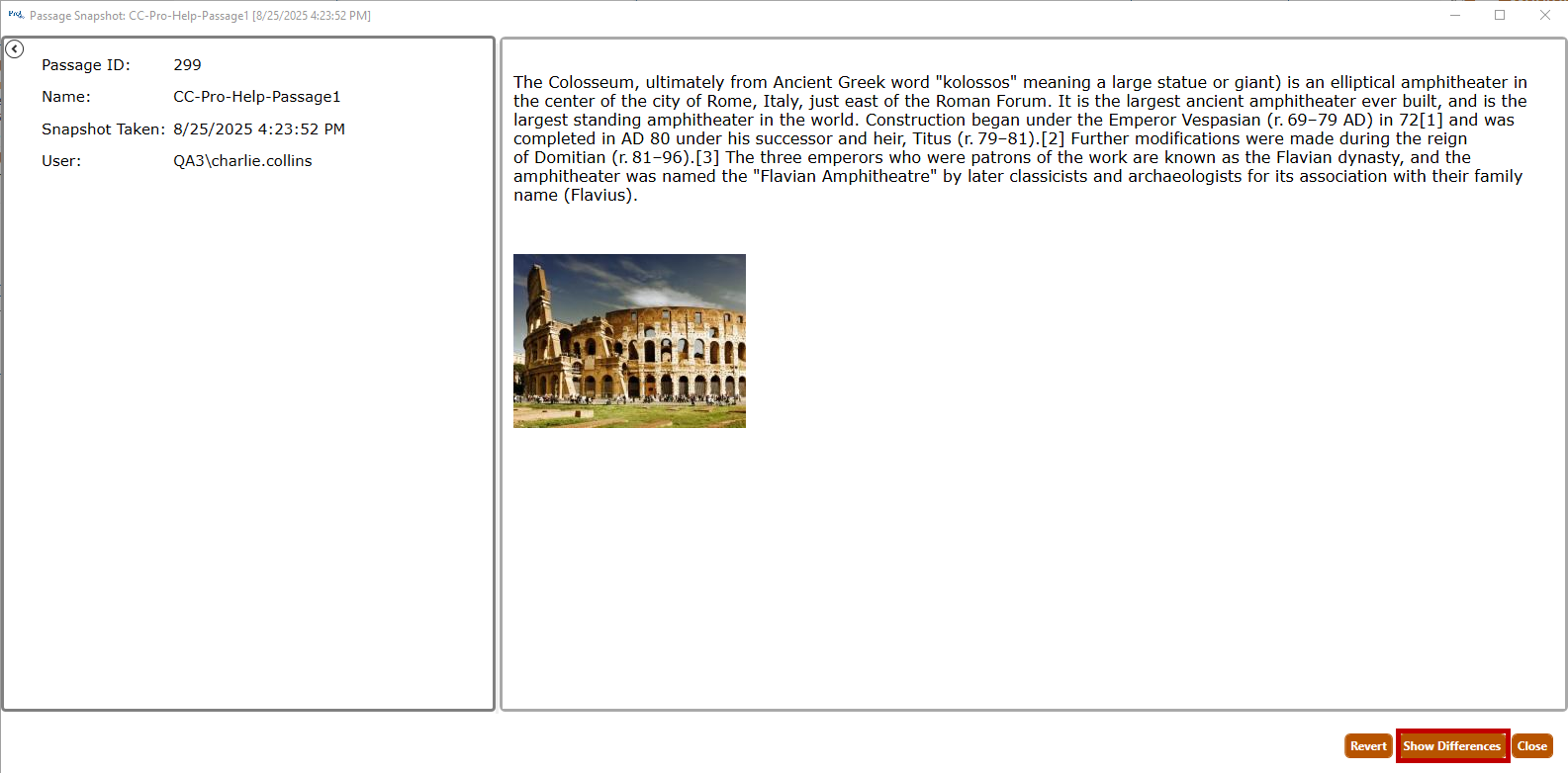 5. Click the Show Differences button (highlighted in red, above) to compare the selected version with the current version of the passage.