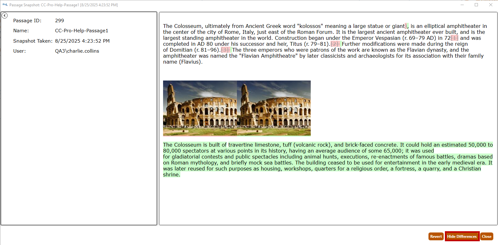 6. The differences between the current version of the passage and the selected version will become highlighted in the content pane of the Passage Snapshot dialogue. Additions to the text will be highlighted in green, while deletions will be highlighted in pink.