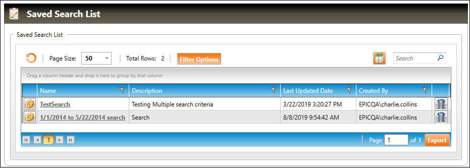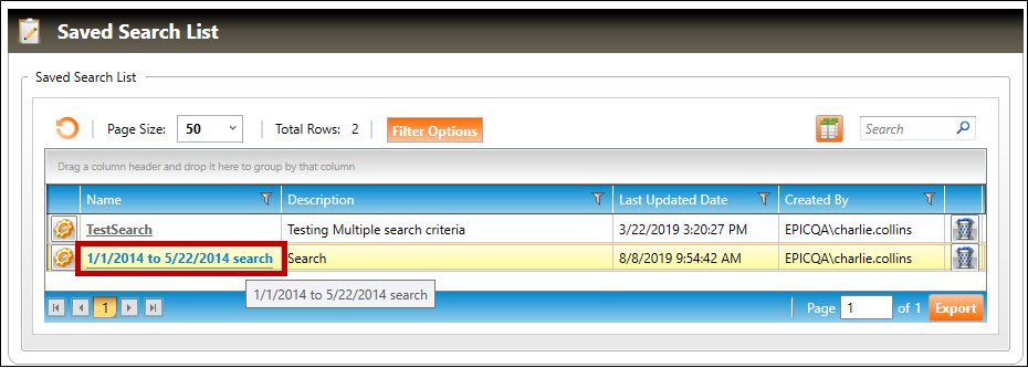 Saved searches will appear in the Saved Search List (shown below). The Name, Description, and Last Updated Date, are shown, along with the user who created the list (Created By).