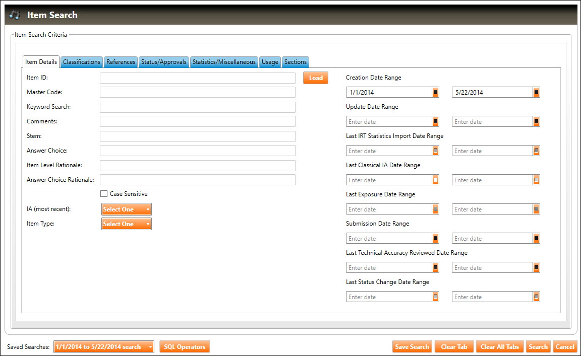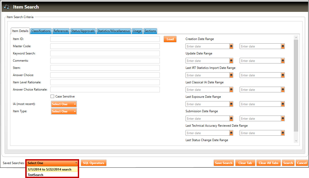 From the Saved Searches dropdown list (highlighted in red, above), select the desired saved search. The Item Search window will appear, showing the criteria of the saved search:
