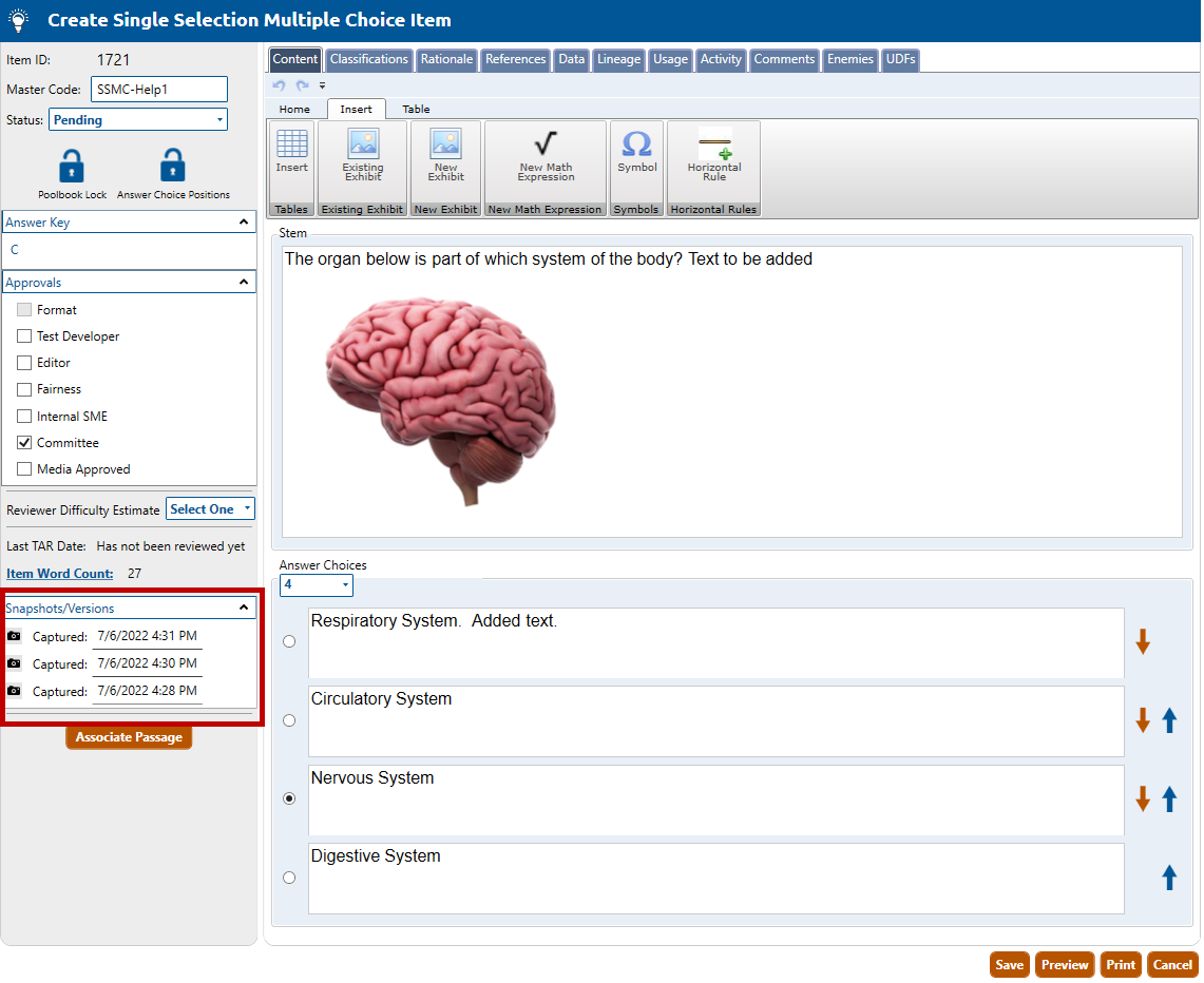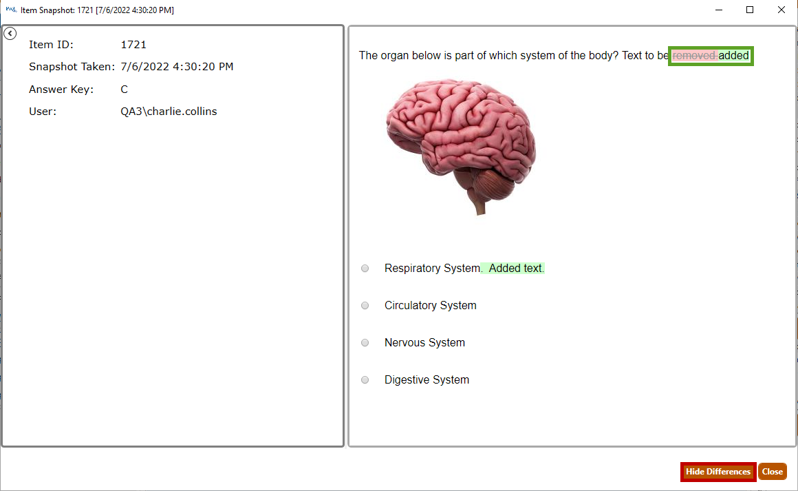 6. The differences between the currently displayed version of the item and the selected version will become highlighted in the content pane of the Item Snapshot window. Additions to the text will be highlighted in green, while deletions will be highlighted in pink.