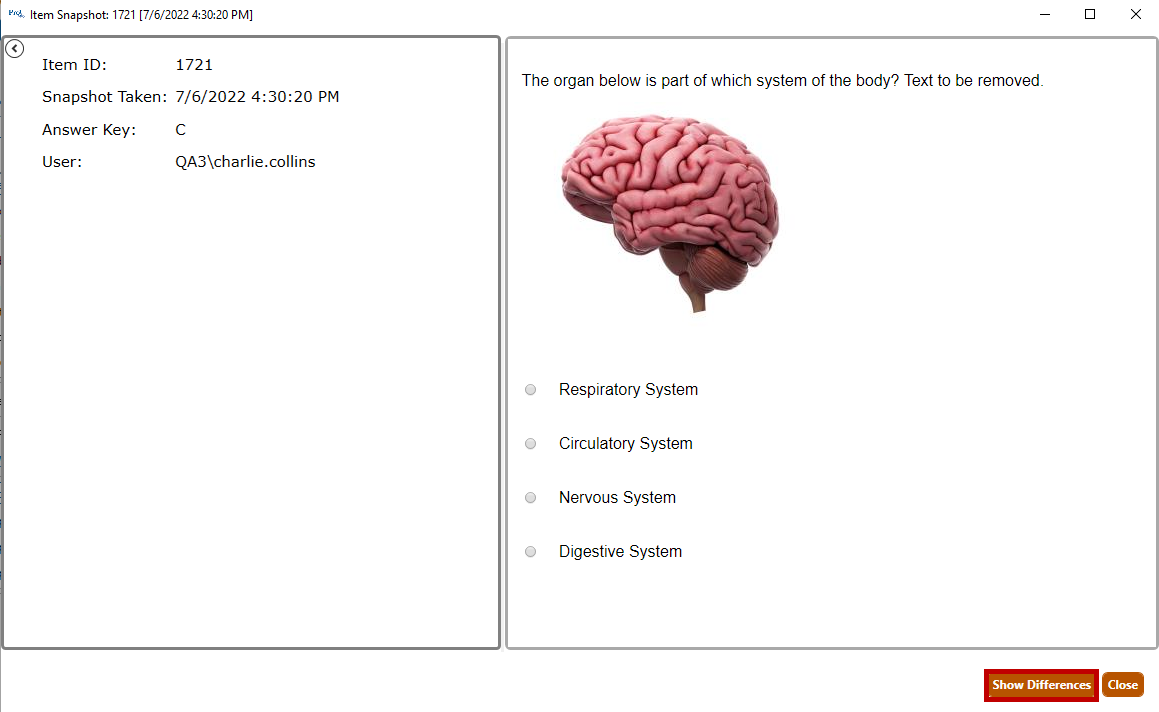 5. Click the Show Differences button (highlighted in red, above) to compare the selected snapshot with the currently displayed version of the item.