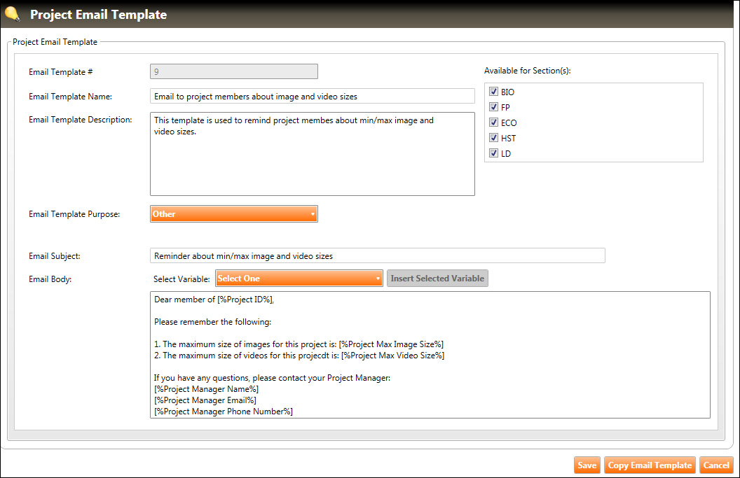 3. Click a Template ID (highlighted in red, above) to open a Project Email Template: