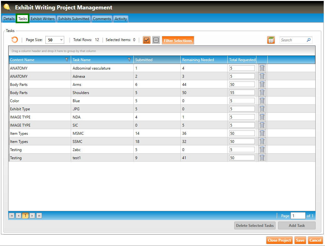 Viewing exhibit project tasks