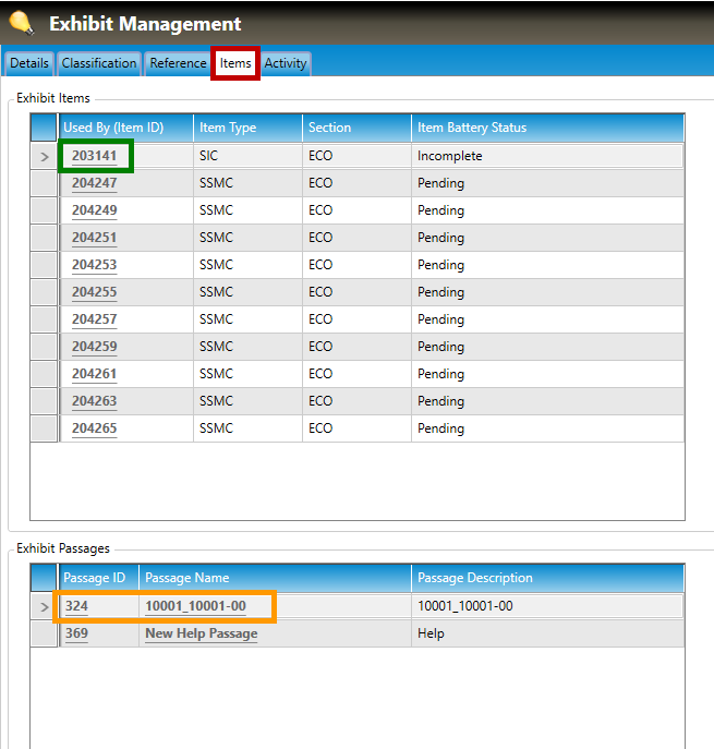 3. A list of items that use the exhibit (listed numerically by Item ID) is available. Click on the hyperlink of an Item ID (highlighted in green, below) to open the item in a separate tab.