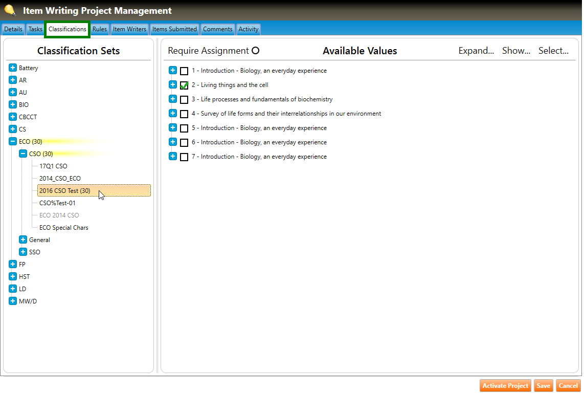 1. Navigate to the Classifications tab of the Item Writing Project Management screen (highlighted in green below). Any section with classification sets selected for the project will appear in the Classification Sets pane highlighted in yellow with a selected value count displayed.