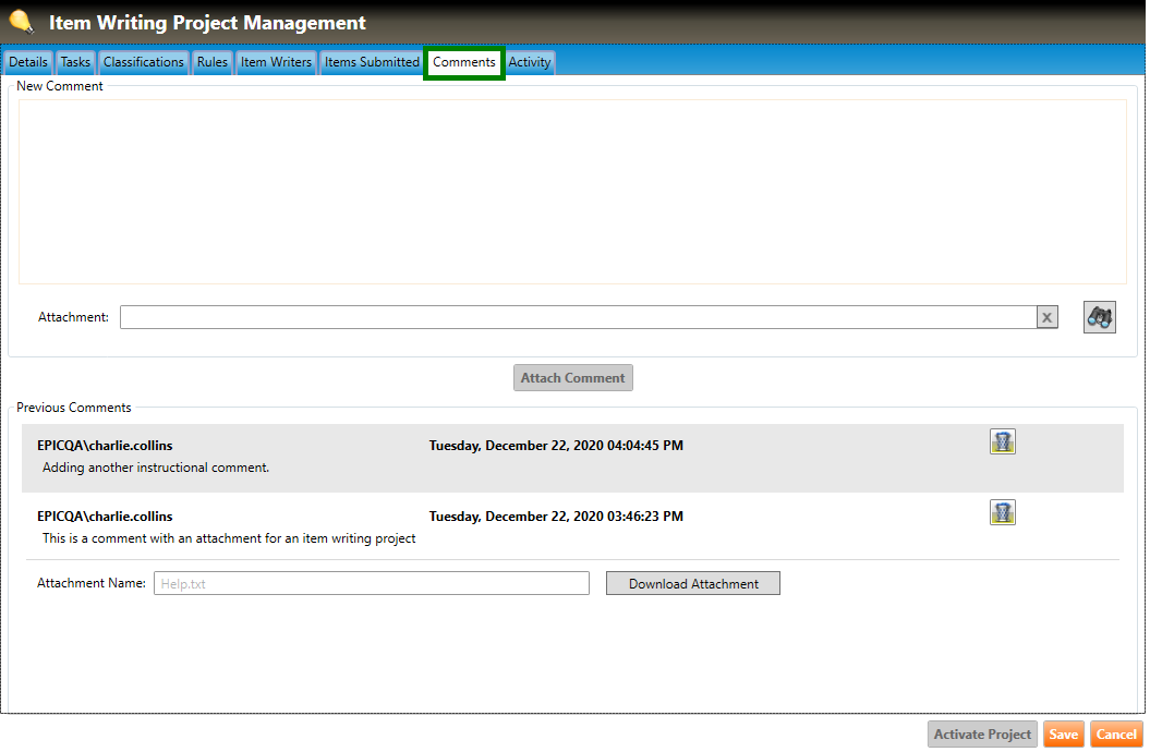 1. Navigate to the Comments tab of the Item Writing Project Management screen (highlighted in green below).