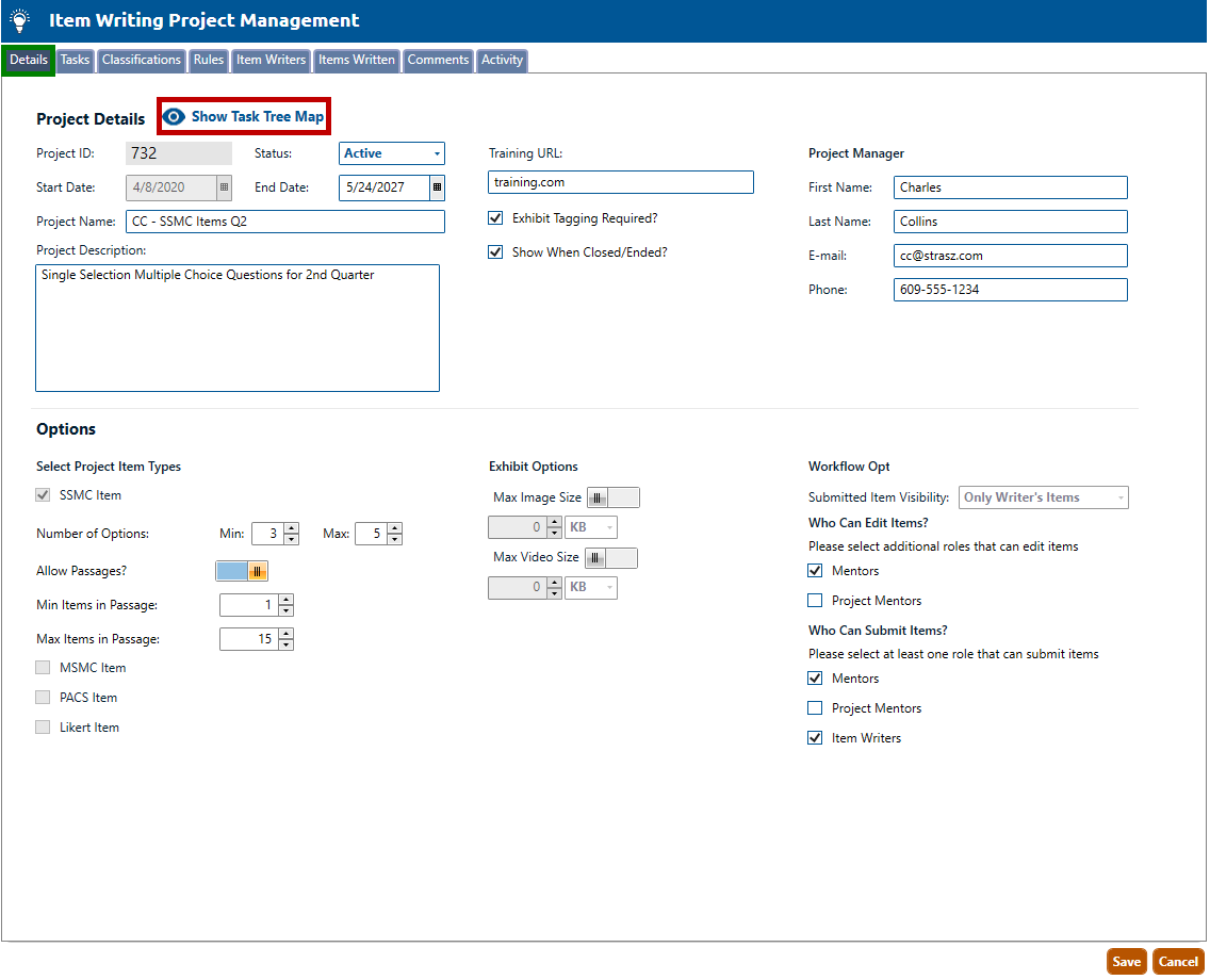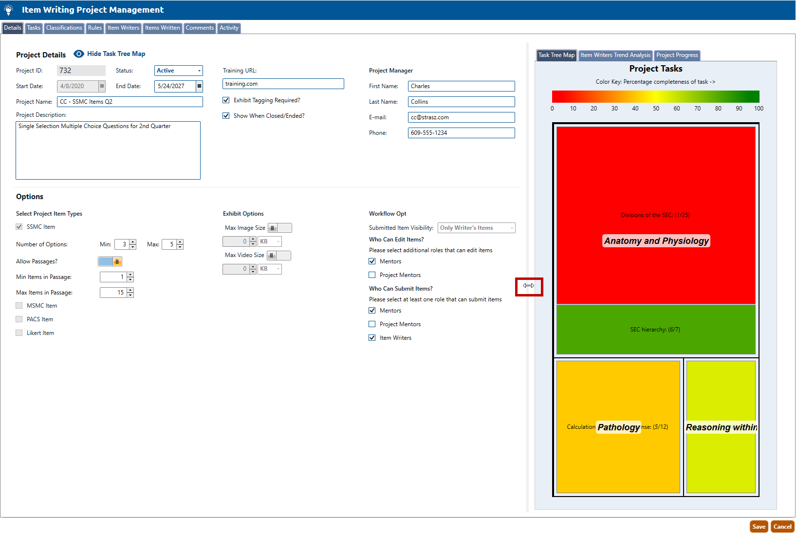 1. Navigate to the Details tab of the Item Writing Project Management screen (highlighted in green, below).