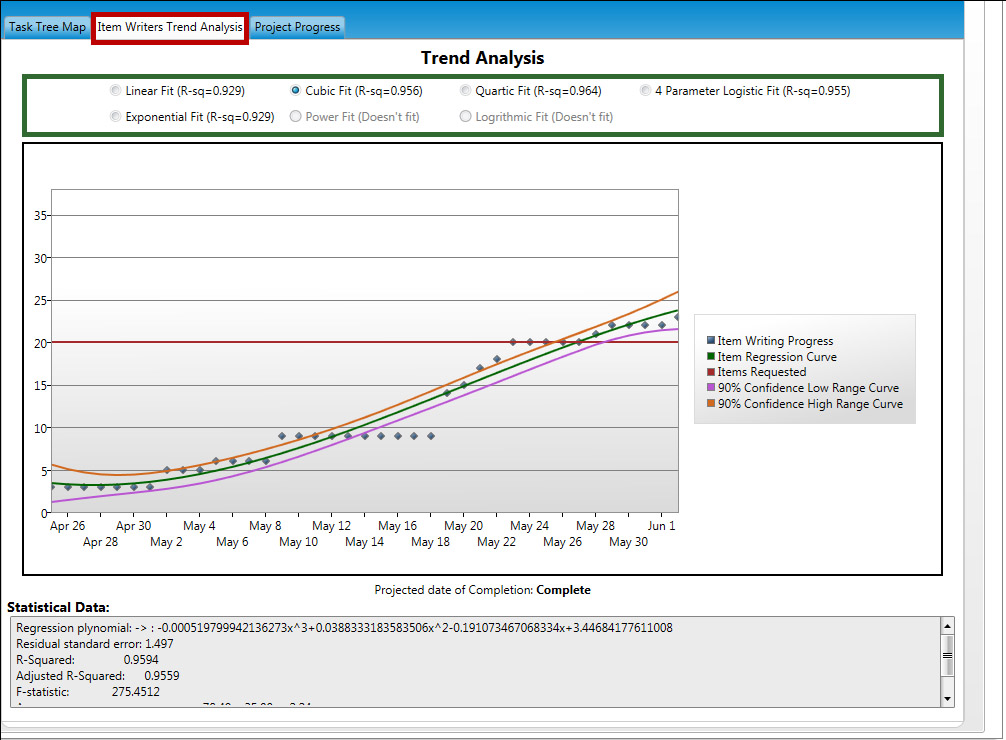 4. To view the regression based trend analysis of items written in a campaign, click the Item Writers Trend Analysis tab (highlighted in red, below), and then click the radio button of the desired trend analysis type (highlighted in green, below):