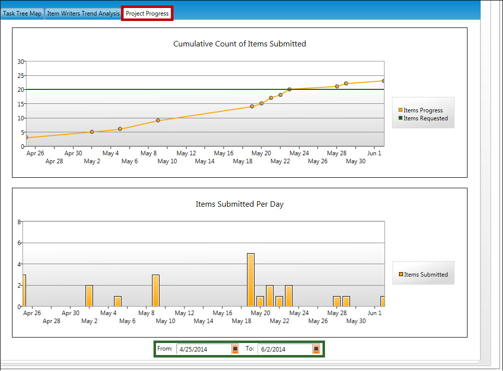5. To view the Cumulative Count of Items Submitted, and Items Submitted Per Day, click the Project Progress tab (highlighted in red, below). For the Items Submitted Per Day graph, you may change the parameters by modifying the From and To dates (highlighted in green, below).