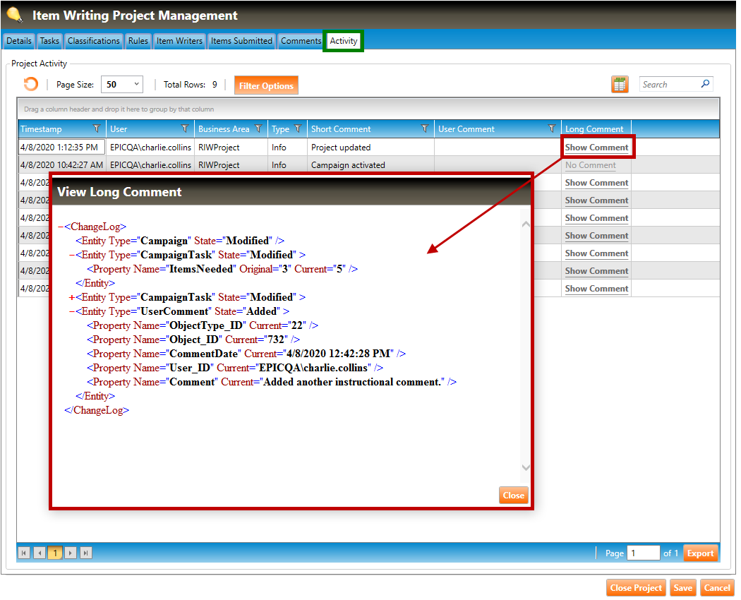 2. To view the long comment, click the Show Comment hyperlink (highlighted in red, above). The long comment will open in a popup window.
