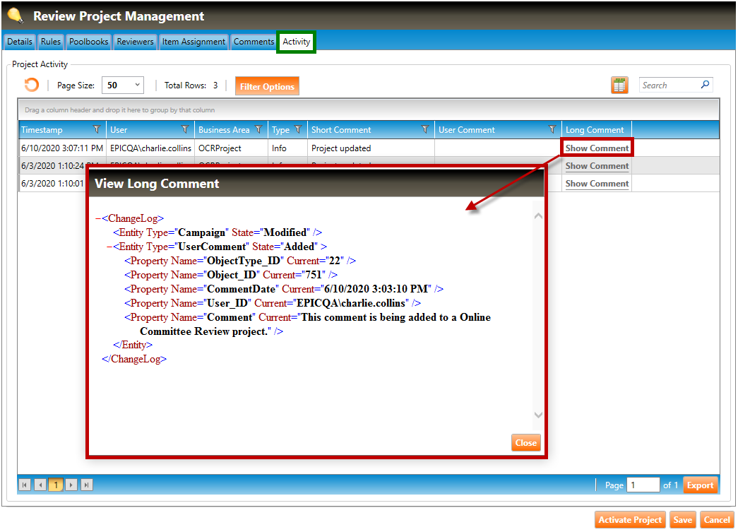 1. Navigate to the Activity tab of the Review Project Management screen (highlighted in green below).