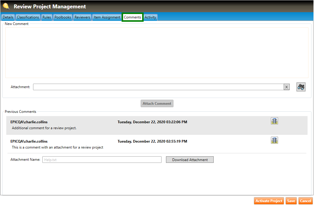 1. Navigate to the Comments tab of the Review Project Management screen (highlighted in green below).