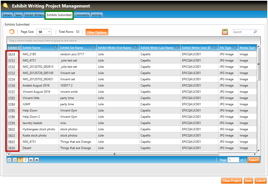 1. Navigate to the Exhibits Submitted tab of the Exhibit Writing Project Management screen (highlighted in green below).