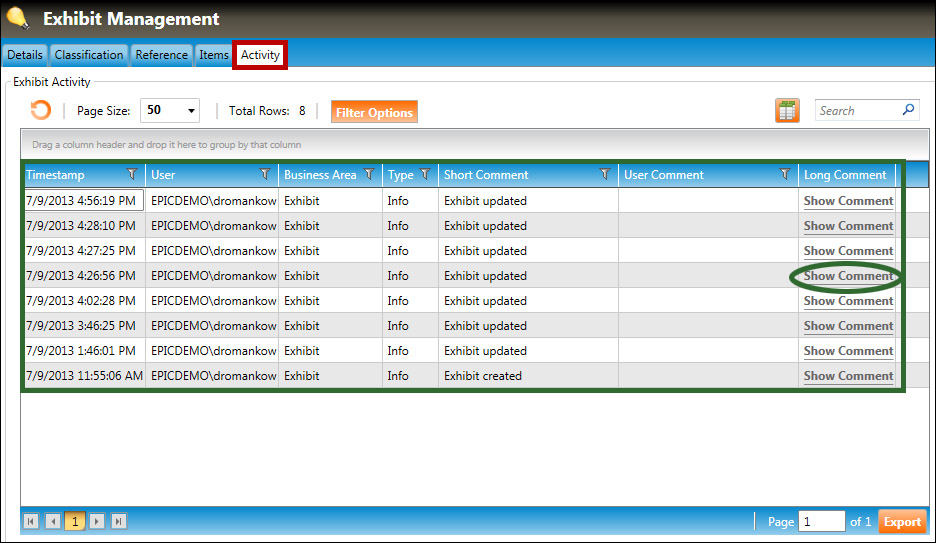 Whenever users perform activities on exhibits, Pro! logs the activities in the system's Activity Log. The log contains information such as the date/time the event occurred, the user name of the person who caused the event to occur (or "system," if the event occurred as a result of system activity), a short description of the type of event that occurred, etc.